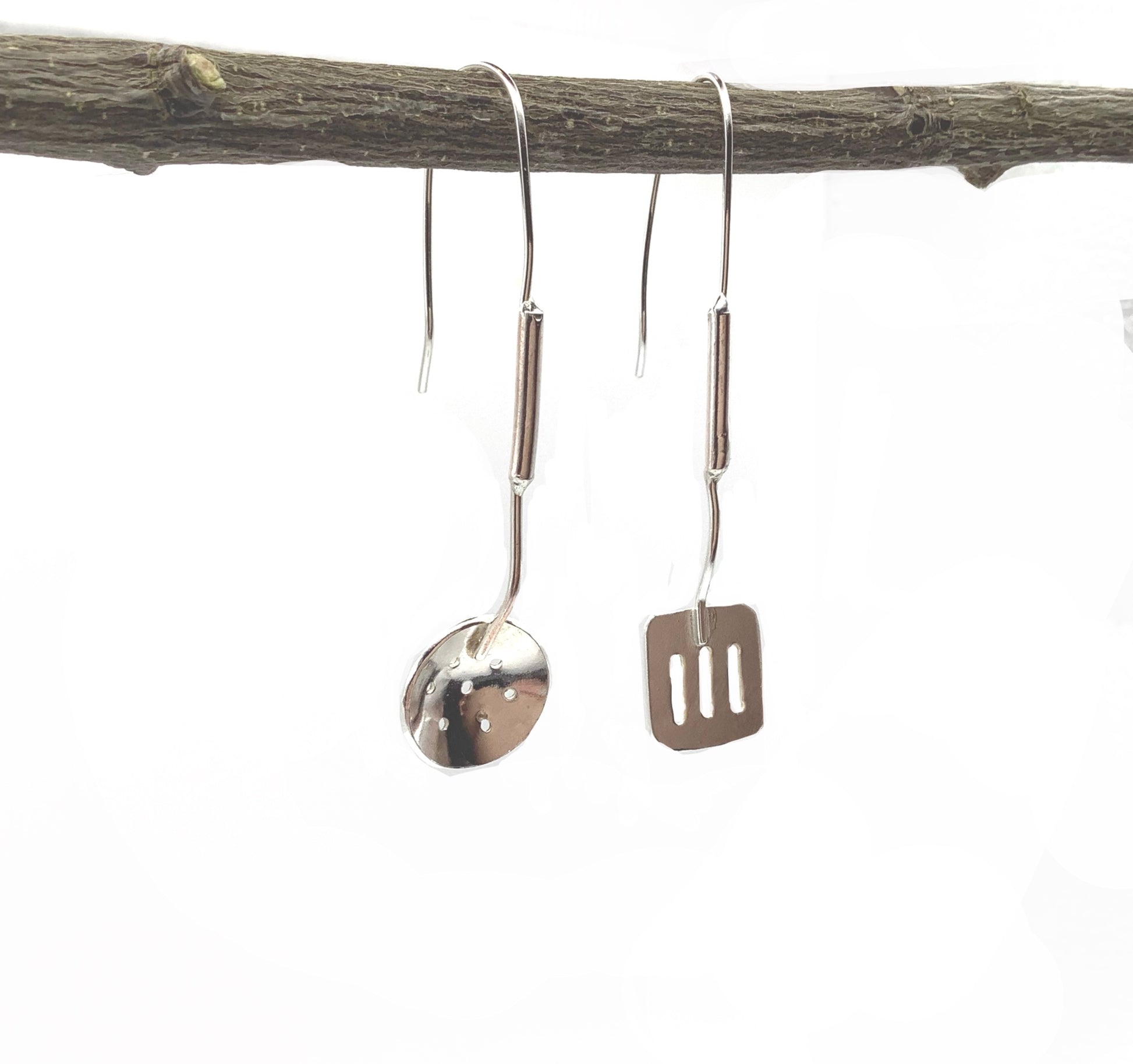 Sterling silver spoon and spatula earrings which dangle 6cm long.