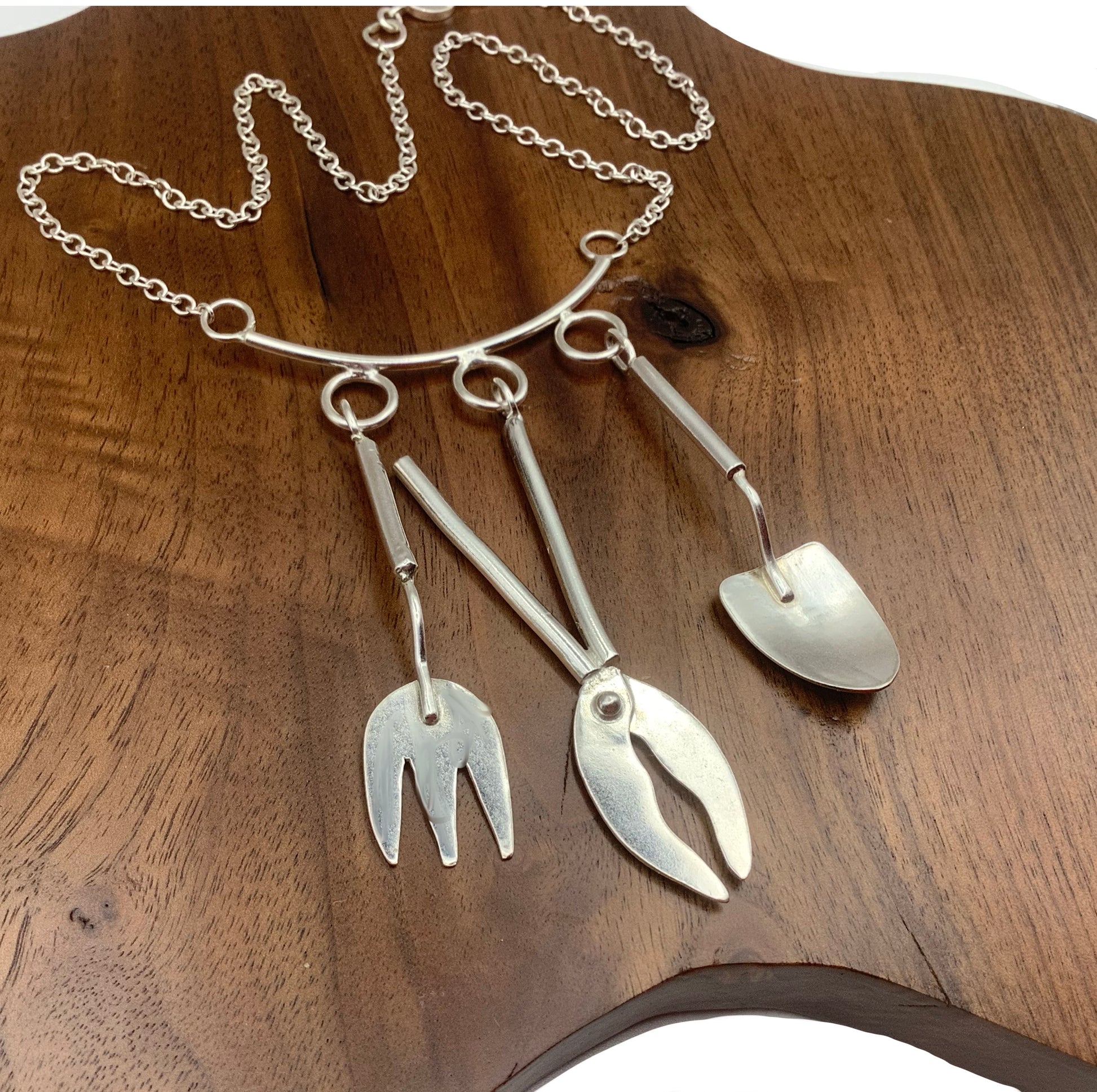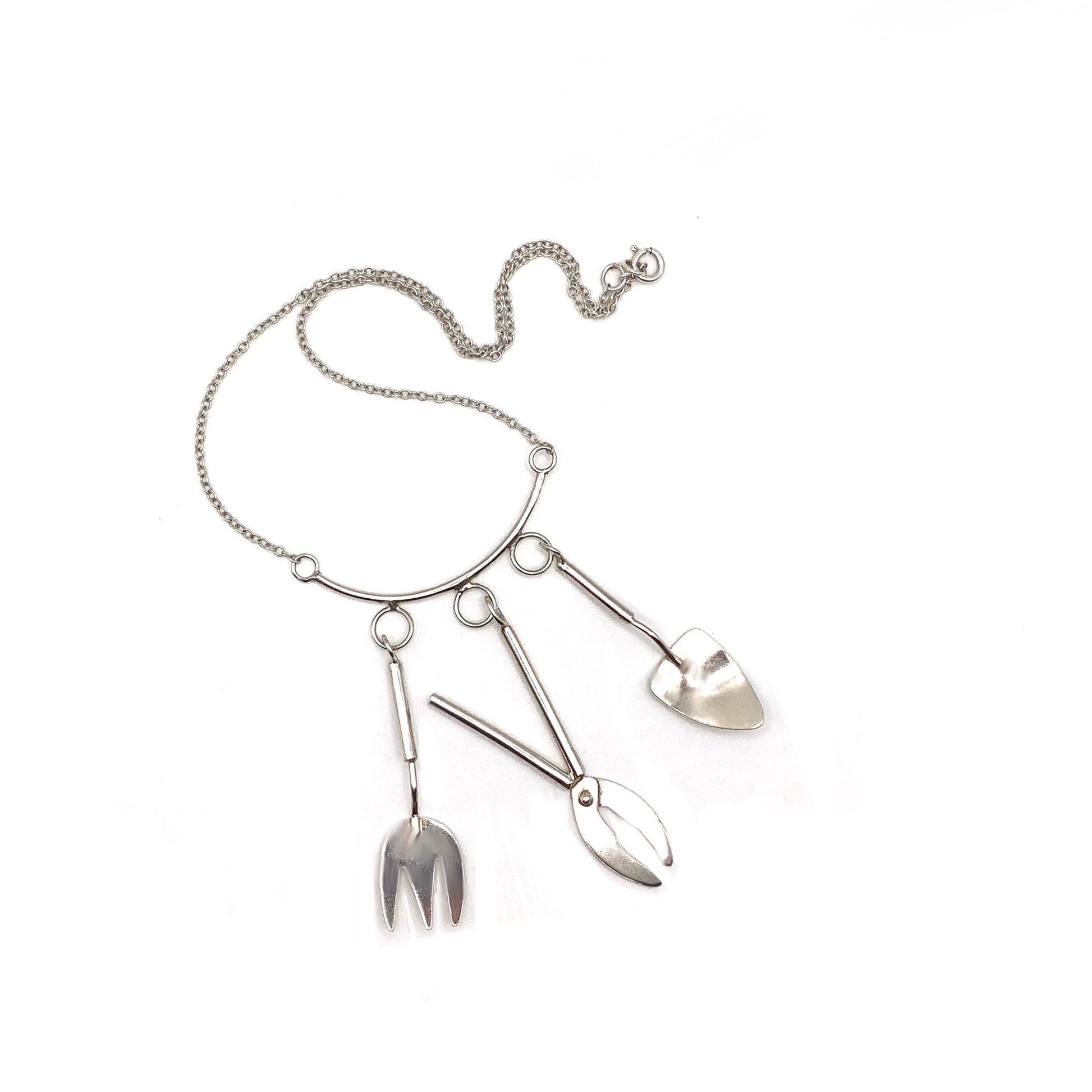 Sterling silver gardening tools necklace with spade, fork and shears.