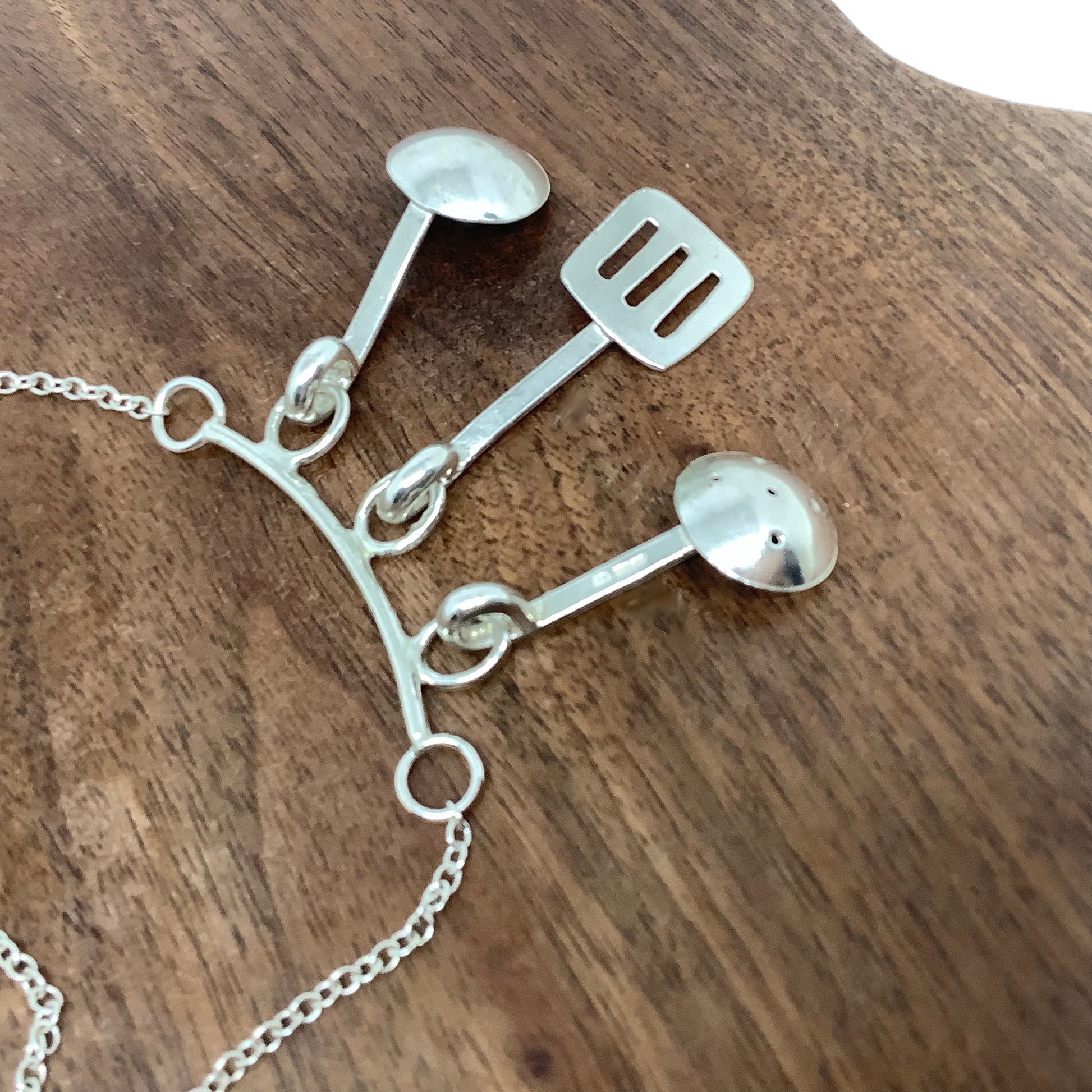 Sterling silver cooking utensils necklace with ladle, spatula and sieve.